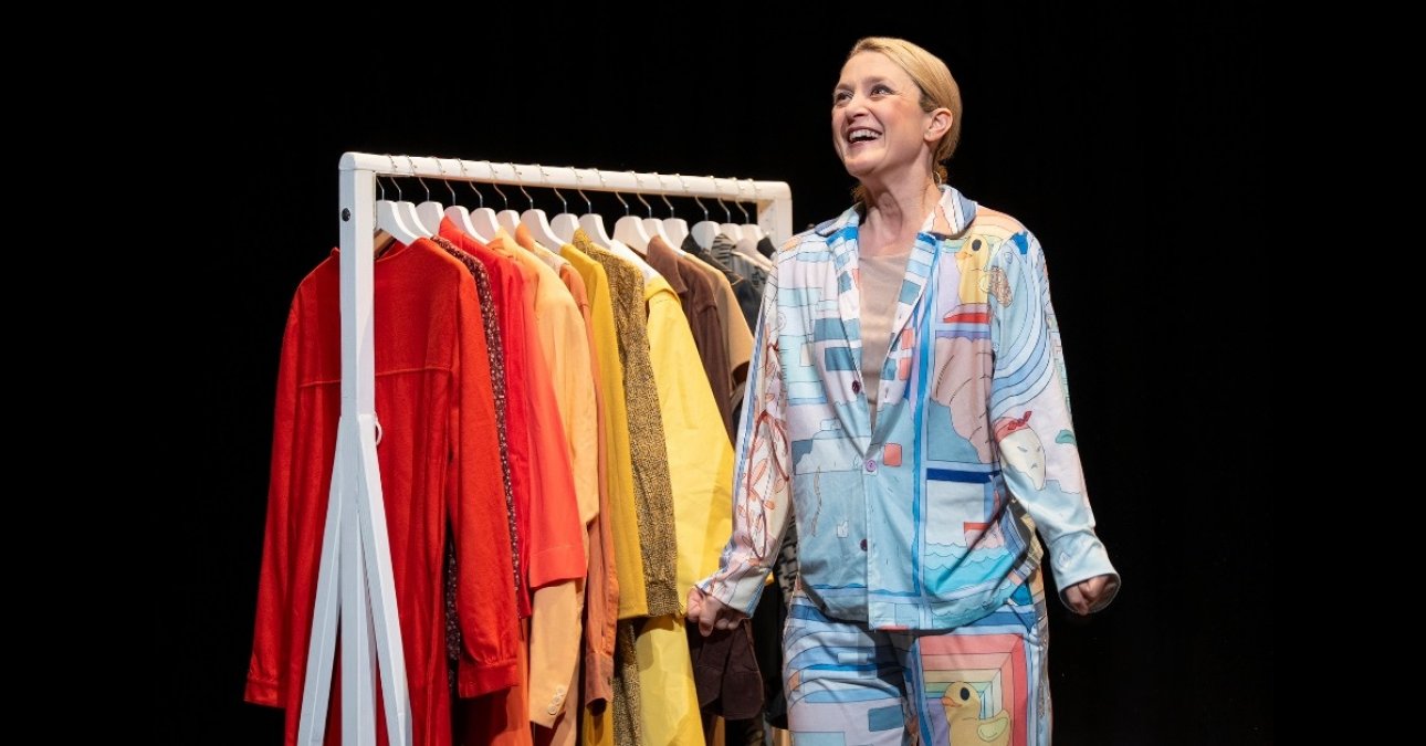 In scena, un’attrice e due strutture piene di abiti colorati.