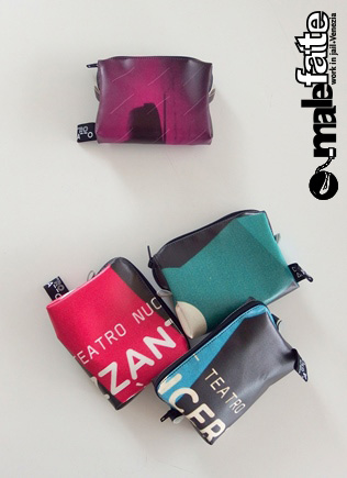 Pochette da borsa in morbido PVC riciclato delle stagioni Teatro Contatto, porta trucchi, porta documenti, chiusura zip nera, ideata e realizzata nel carcere di Venezia da Malefatte – Rio Terà dei Pensieri