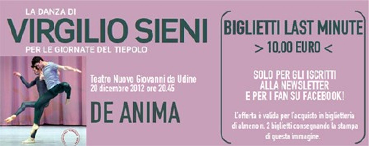 La Compagnia Virgilio Sieni debutta per la prima volta sul grande palcoscenico del Teatro Nuovo Giovanni da Udine con lo spettacolo De Anima, un grandioso affresco rarefatto e inquieto, illuminato dal tenue cromatismo dei colori del Tiepolo. Sul palcoscenico aperto si muovono sei presenze di picassiana memoria, inquiete e disarticolate eppure dotate di una lievità struggente, perfetta: sei arlecchini senza maschera, che emergono e scompaiono da quel fondale "rosa Tiepolo" che è unico elemento aggiunto al palcoscenico nudo.