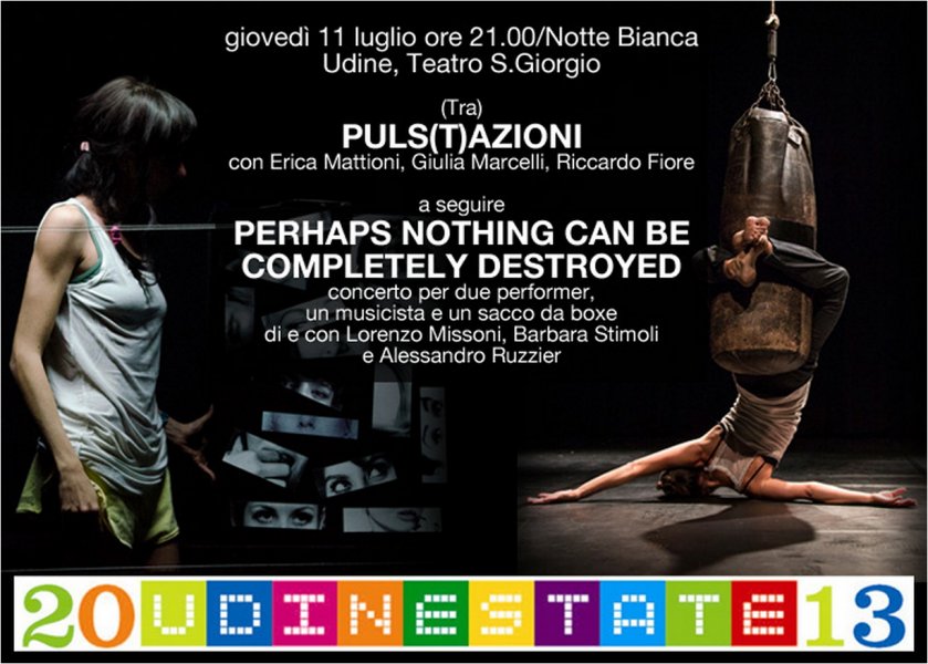 PERHAPS NOTHING CAN BE COMPLETELY DESTROYED oscilla fra unicità dell’esecuzione e azione ripetibile. Ma che cosa resta di quell'azione quando si arresta? Come continua a risuonare nel corpo e nell'anima dello spettatore? Due performer immersi nel paesaggio sonoro emozionale creato dal vivo da un musicista compositore. Un performer gioca con il moto perpetuo della vita, fa risuonare il suo battito. L’altra fa di un sacco da box il suo doppio, in una relazione: un compagno, amante, antagonista, confidente, fino a essere solo cuore che batte.