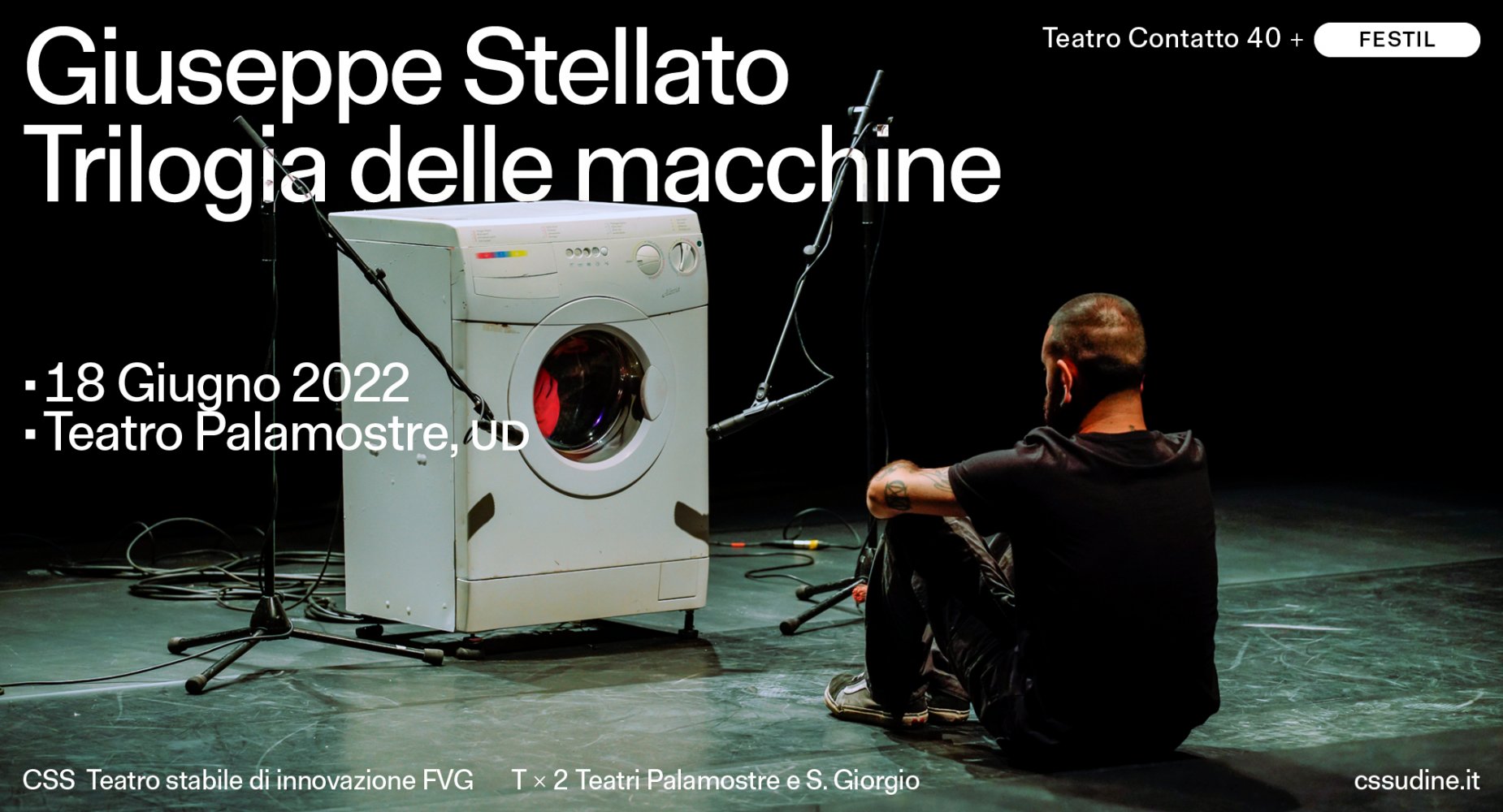 A Udine, la collaborazione fra FESTIL e l’estate Teatro Contatto 40, la Stagione lunga un anno del CSS, dà vita a un percorso di 13 spettacoli fra i Teatri Palamostre e S. Giorgio. Apre l’edizione 2022, sabato 18 giugno, l’artista multimediale Giuseppe Stellato con la Trilogia delle macchine (Oblò | Mind the Gap | Automated Teller Machine), un trittico di installazioni-performance con protagonisti una lavatrice, un distributore di snack e bibite e un bancomat ATM.