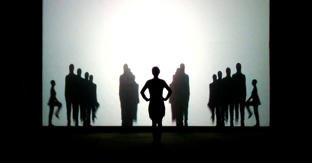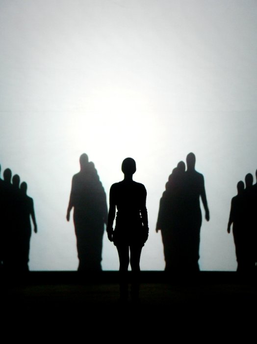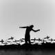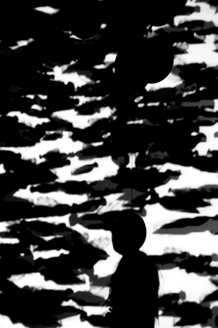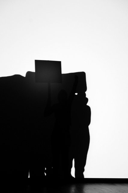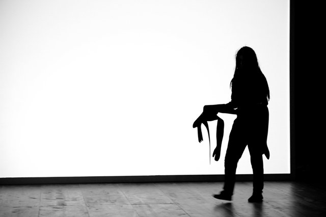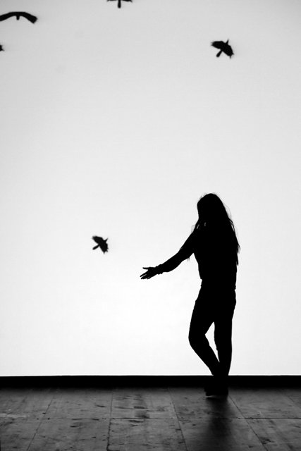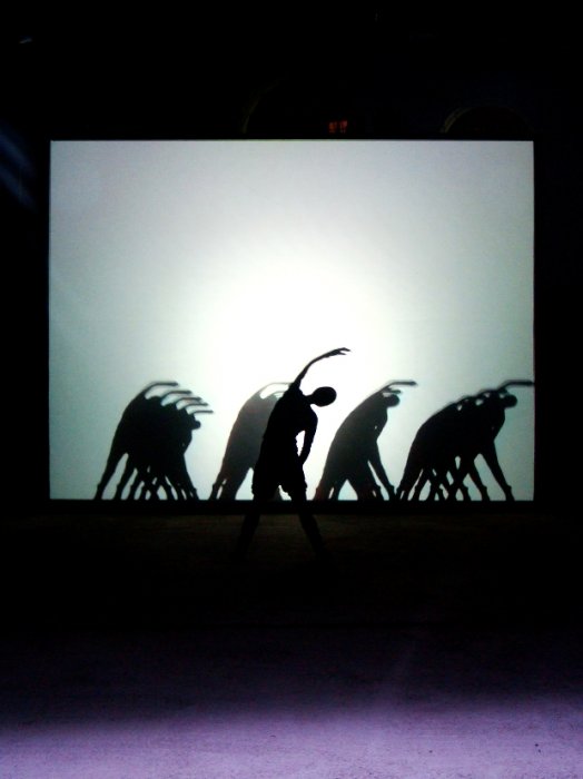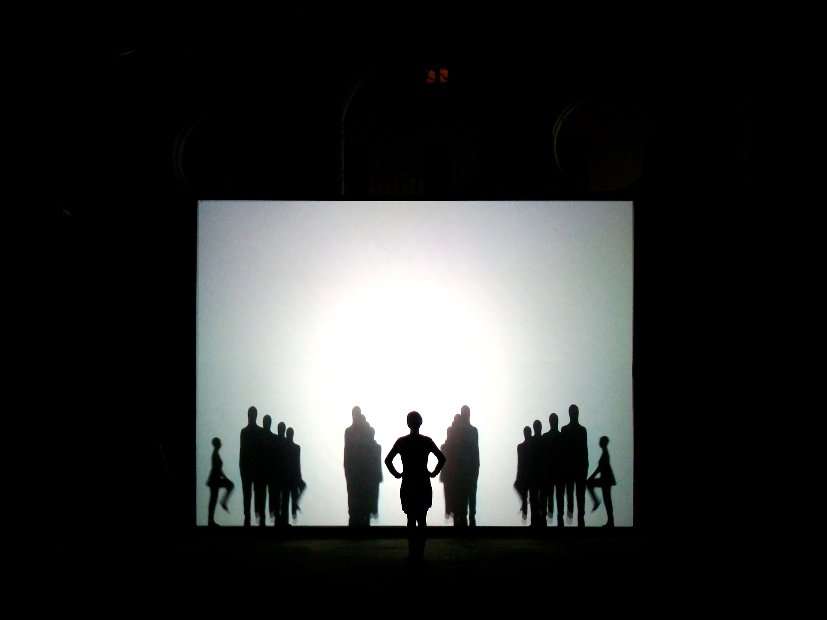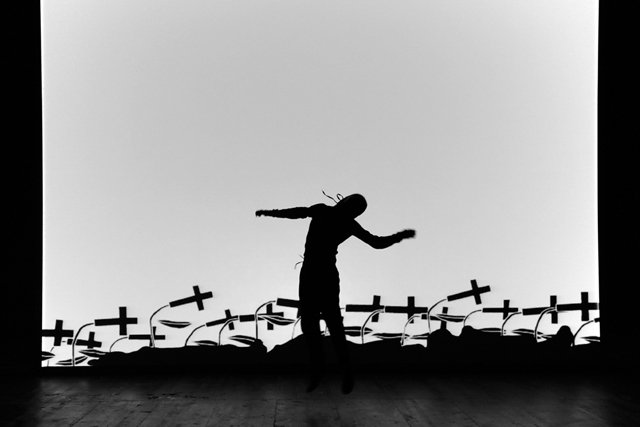 ... nello spazio bidimensionale dello schermo immagini di silhouette nere entrano in marcia, mondi cartoon decadenti prendono vita, mentre la performer Eva Geatti guadagna la scena e alterna la sua presenza abitando come ombra fra le ombre lo schermo o, al contrario, tentando di trasportare sul palco i rimasugli di quel mondo bidimensionale. Figurina nera, la performer, istaura un rapporto con le figure animate che appaiono sullo schermo: soldati in marcia, masse di uomini in protesta, piccoli uccellini uccisi a fucilate, sagome di corpi neri che cadono a terra mentre fiori mossi dal vento divengono croci e mostri-ombra inghiottono la figura della Geatti. (...)