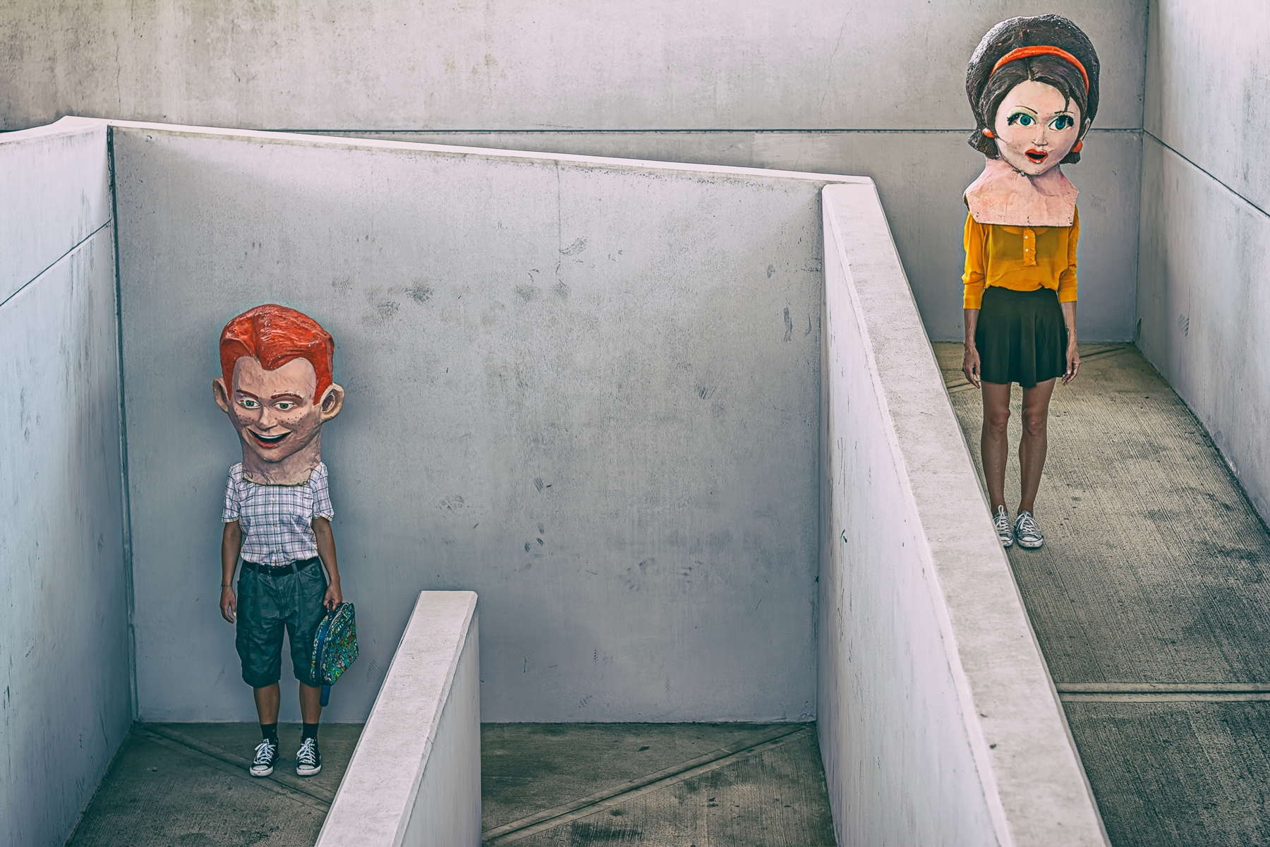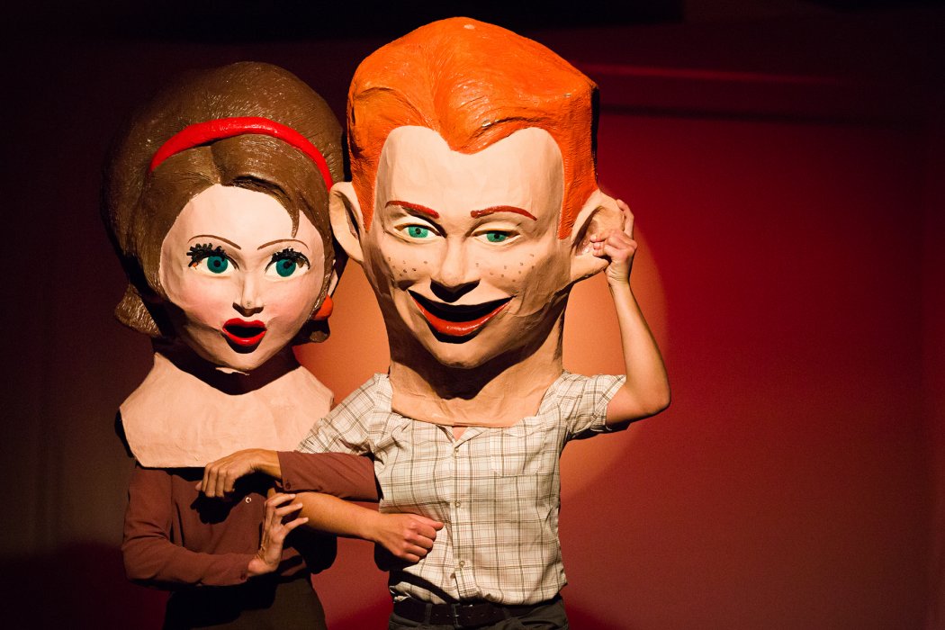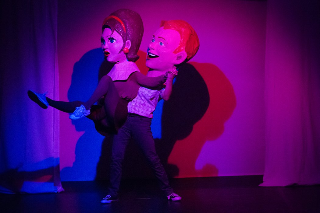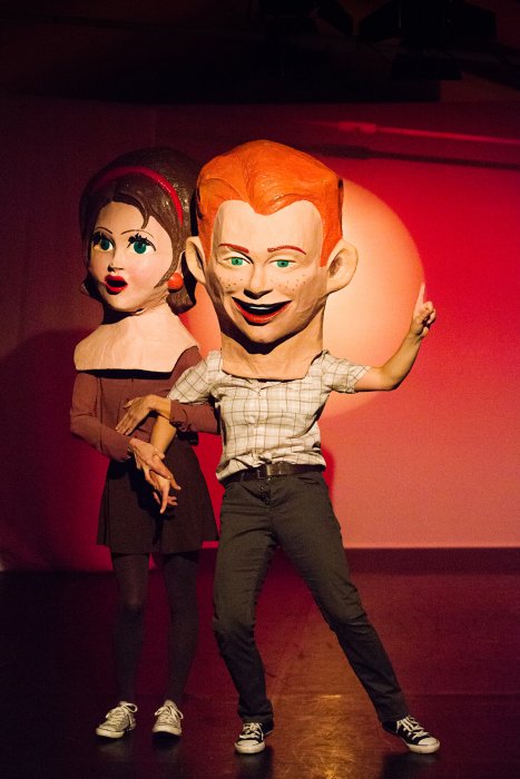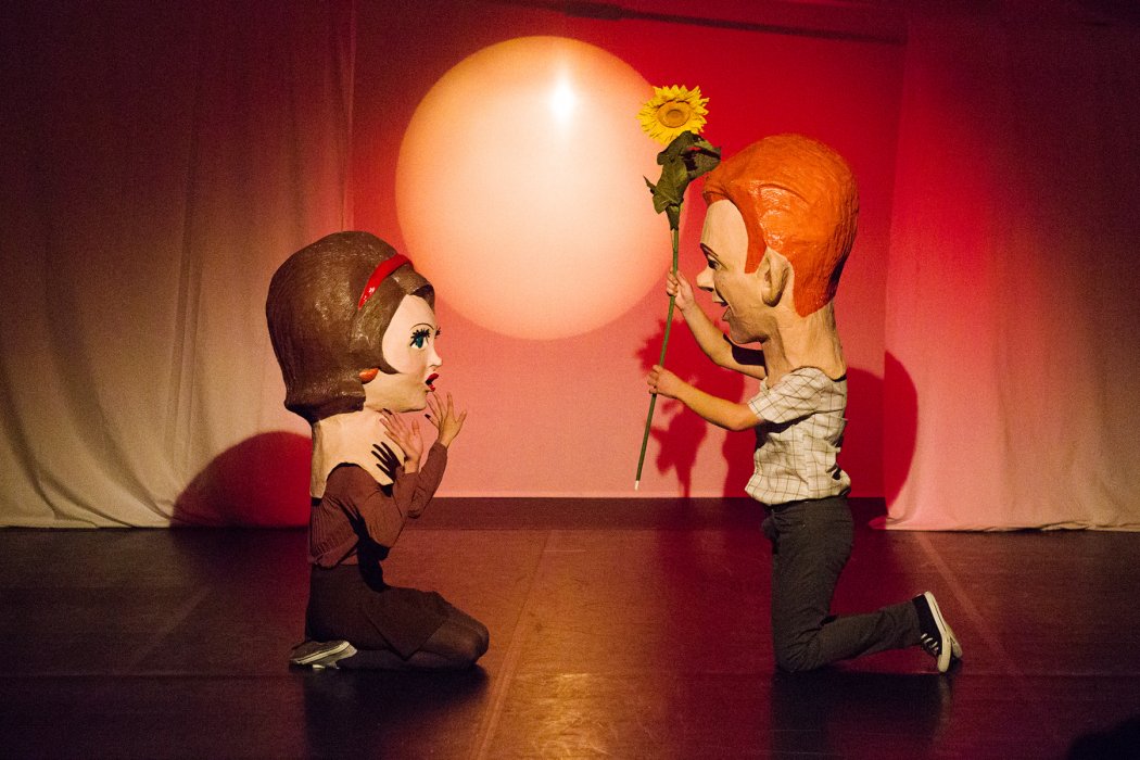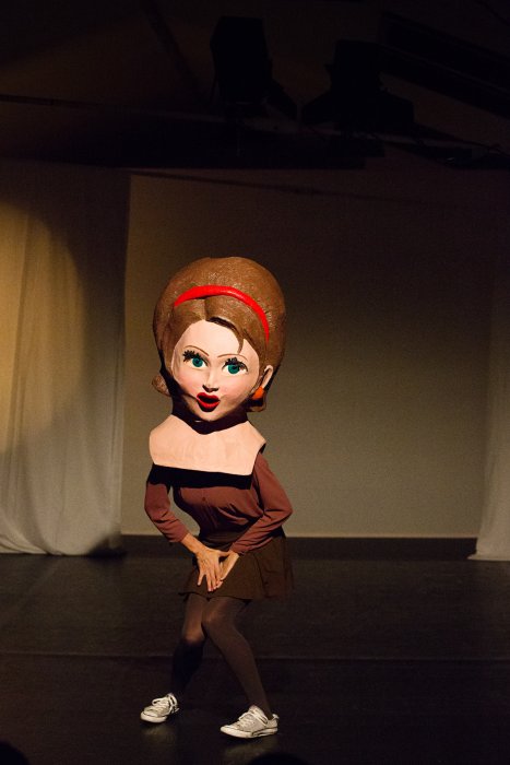 A man and a woman with two large heads, containers for memories, ambitions, fears and neuroses. Two heads so swollen and heavy that they impede movement and paralyse expression. A love story of the absurd for two awkward characters. Strangers to each other, they speak and move with rhythms and times that have different flavours. They observe each other curiously and gauge the space that separates them, a limit that protects them within an area that they know, a soft line that tempts them. At times they want to cross it to touch the presence that seems to be so similar. There is a growing need for dialogue, the need to tell their tales. Their only means is the body, which gains meaning through movement, finding common resonances, counterpoints and gestures that become communication.