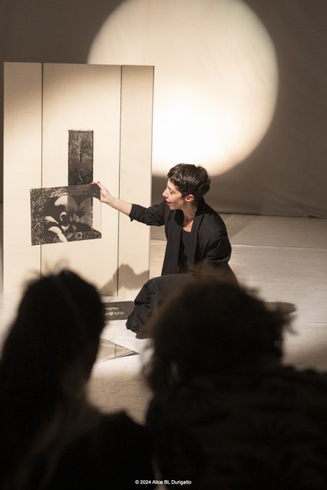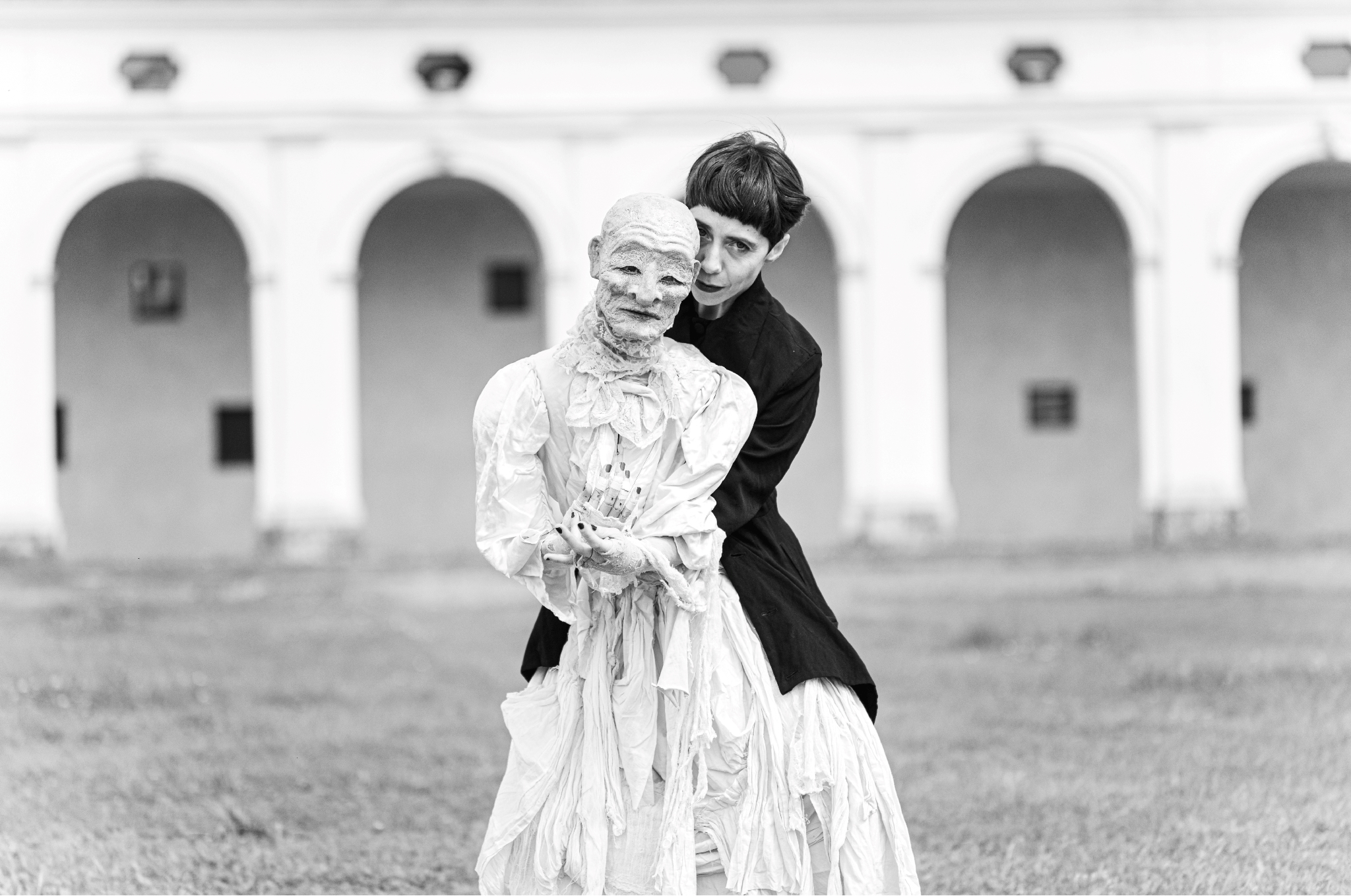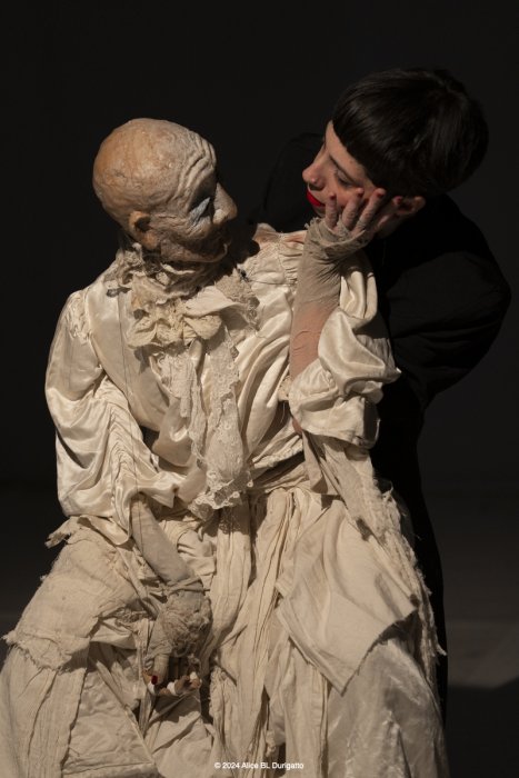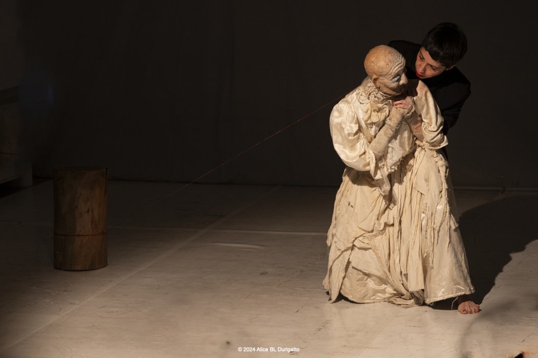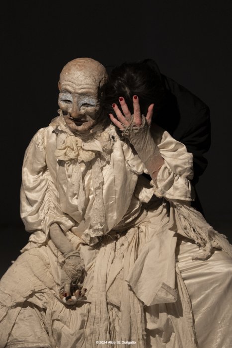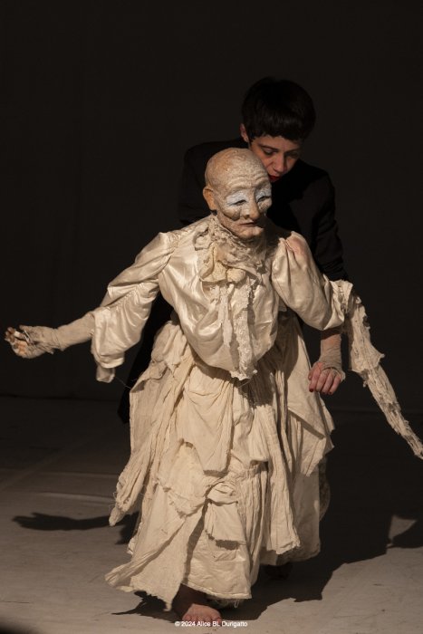 Born as a homage to the butô dancer Kazuo Ono, who began dancing at the age of 51 and did not stop until his death at 101, it has become - over the course of the various residency stages - a work that also questions the Sacred, the meaning of what relates us to the beginning and end of life, the possibilities of being generative and the need for detachment. Central to this is the relationship between the puppet, K., and his double, the puppeteer, a relationship of interdependence that recalls the mother-child bond. The combined effect of visual manipulation creates a splitting, a complex dramaturgy in which anxieties and ghosts are mixed.