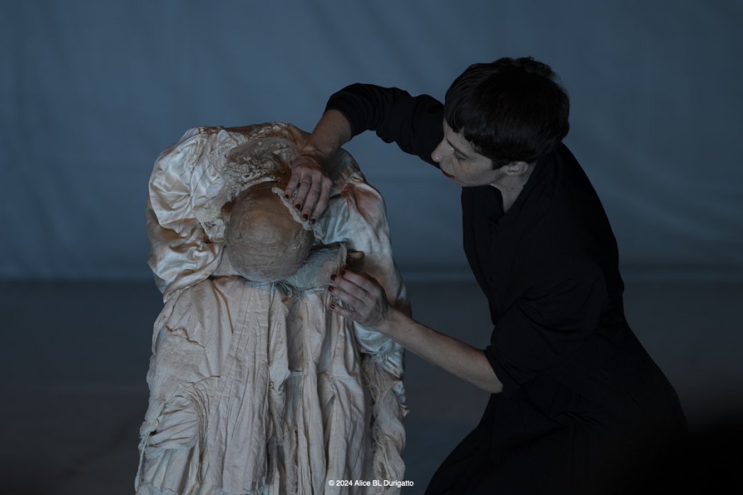 Prayer [for Quiet] is not a butô dance performance, and I do not call myself a buto-ka. I start from butô dance to ask myself performative questions with a puppet. From butô I assume the radicality of the choices, the non-dance, an altered and extra-daily perception of the passing of time, the creation of interior landscapes through the body (bodies). As choreographer Frances Barbe writes: ‘the transformed object of the butô body seeks to escape the banality of the everyday and aims at the domain of poetry (association and metaphor)’. Michela Aiello