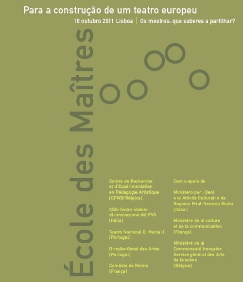 Torna L’Ecole des Maîtres e quest’anno si presenta con un edizione speciale dedicata non alla pratica della formazione teatrale europea con il suo corso itinerante, ma in una forma itinerante tutta teorica di quattro incontri di lavoro dislocati nei quattro Paesi partner – Italia, Francia, Belgio e Portogallo. Gli incontri saranno indispensabili per ridefinire i punti cardine e le pratiche del corso internazionale di perfezionamento teatrale ideato vent’anni fa dal critico teatrale Franco Quadri e diventato negli anni uno dei progetti formativi di riferimento e più ambiti dagli attori di tutta Europa. “L’Ecole des Maitres per la costruzione di un teatro europeo” è il titolo di questa edizione speciale 2011 con gli occhi puntati al futuro, ideata e promossa da Centre de Recherche et d’Expérimentation en Pédagogie Artistique (Belgio), CSS Teatro stabile di innovazione del FVG (Italia), Teatro Nacional D. Maria II (Portogallo), Direçao-Geral das Artes (Portogallo), Comédie de Reims.