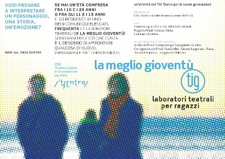Alla guida del laboratorio per ragazzi fra gli 11 e i 15 anni ci sarà invece Francesco Accomando attore e regista professionista del CSS Teatro stabile di innovazione del FVG. La durata del suo laboratorio è di 20 incontri, previsti ogni mercoledì pomeriggio, dalle 17.30 alle 19.30, a partire dal 9 novembre.