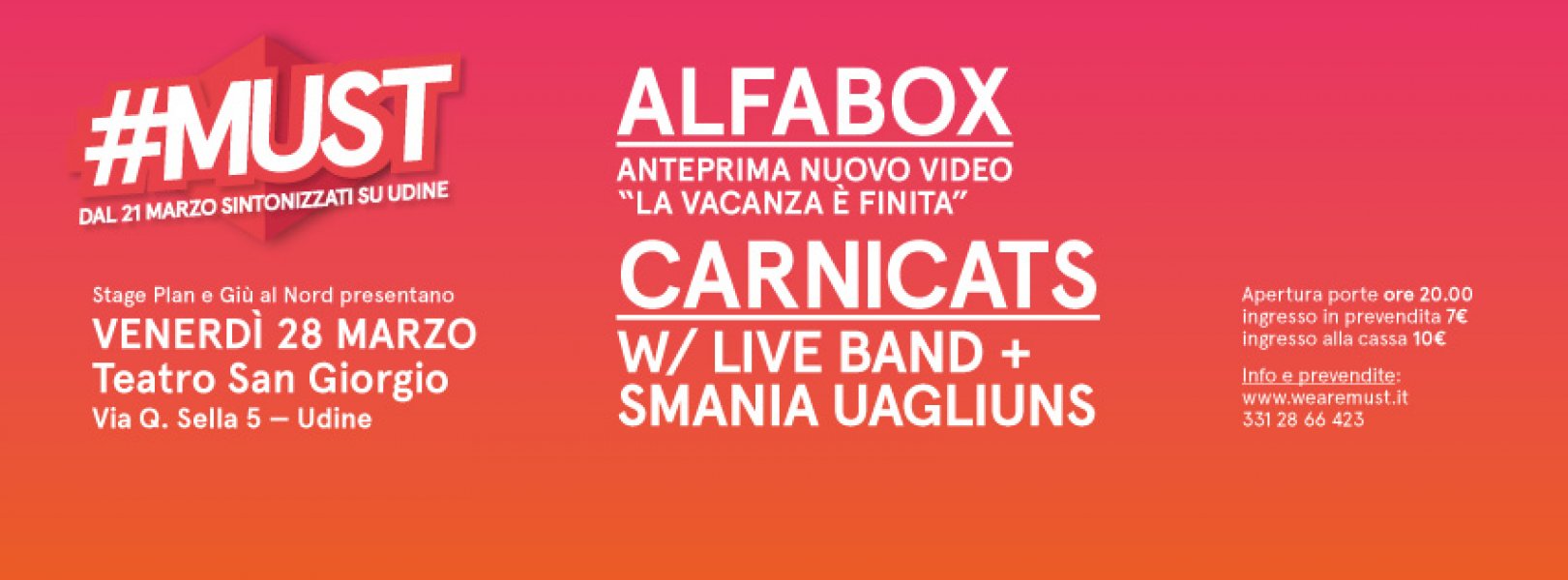 NUOVA SERATA PER MuSt, LA MUSIC STATION DELLE SERATE LIVE AL TEATRO S.GIORGIO DI UDINE: VENERDÌ 28 MARZO SUL PALCO L’ENERGIA DEGLI ALFABOX, I CARNICATS, CON LA PARTECIPAZIONE DEGLI SMANIA UAGLIUNS!