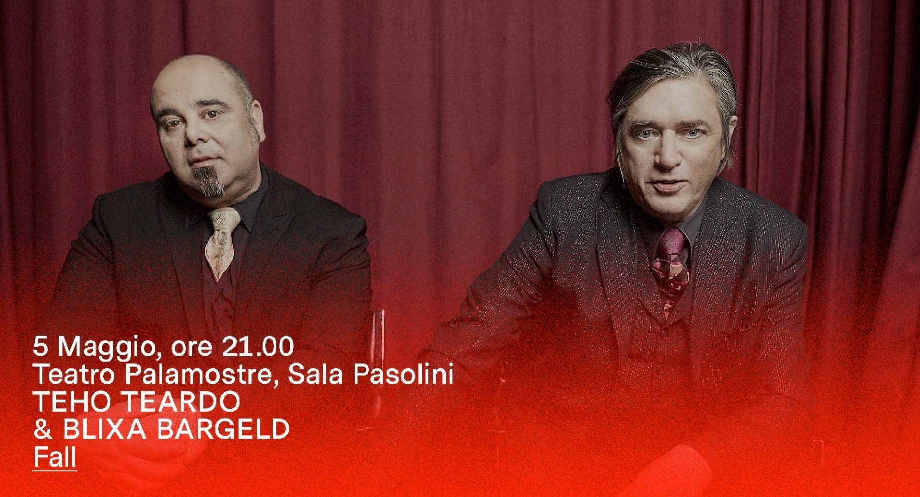 La Stagione Teatro Contatto 36 del CSS culmina con Fall, il concerto dei due ambasciatori della musica europea, sempre più affiatati e attesi in versione live, da camera: Teho Teardo & Blixa Bargeld - finalmente a Udine.