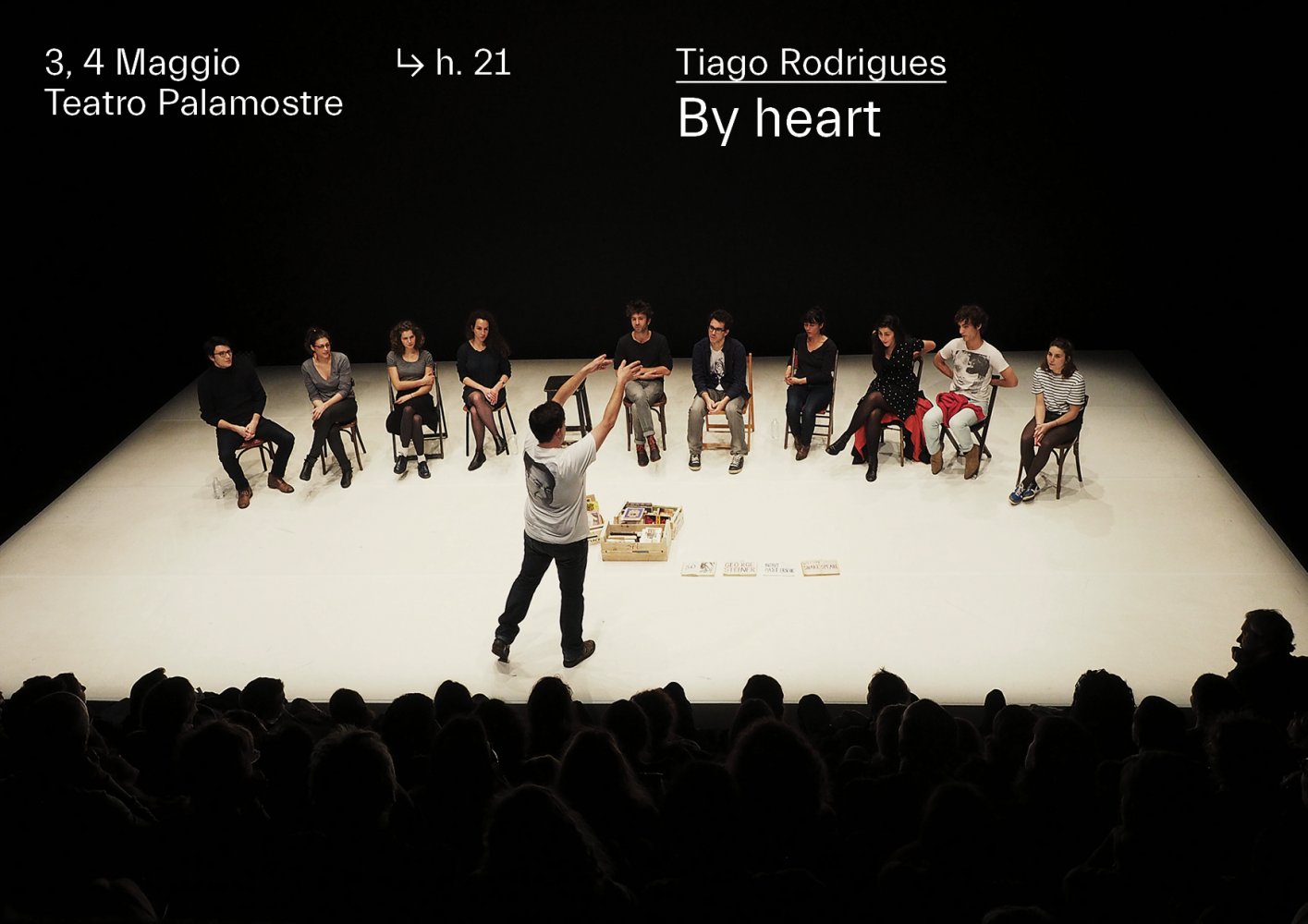 Artista di fama internazionale e autore di un teatro sovversivo e poetico, Tiago Rodrigues ha sempre concepito il teatro come un' assemblea umana: un luogo in cui le persone si incontrano, per scambiarsi pensieri e condividere il loro tempo.  Ad ogni replica, Rodrigues invita anche dieci spettatori a salire sul palco assieme a lui. Invita uomini e donne a sperimentare, a condividere, il tempo della rappresentazione, e un'esperienza singolare: chiede loro di imparare un breve testo non solo "a memoria" ma anche "con il cuore" (come suggerisce il titolo “By Heart” in inglese).
