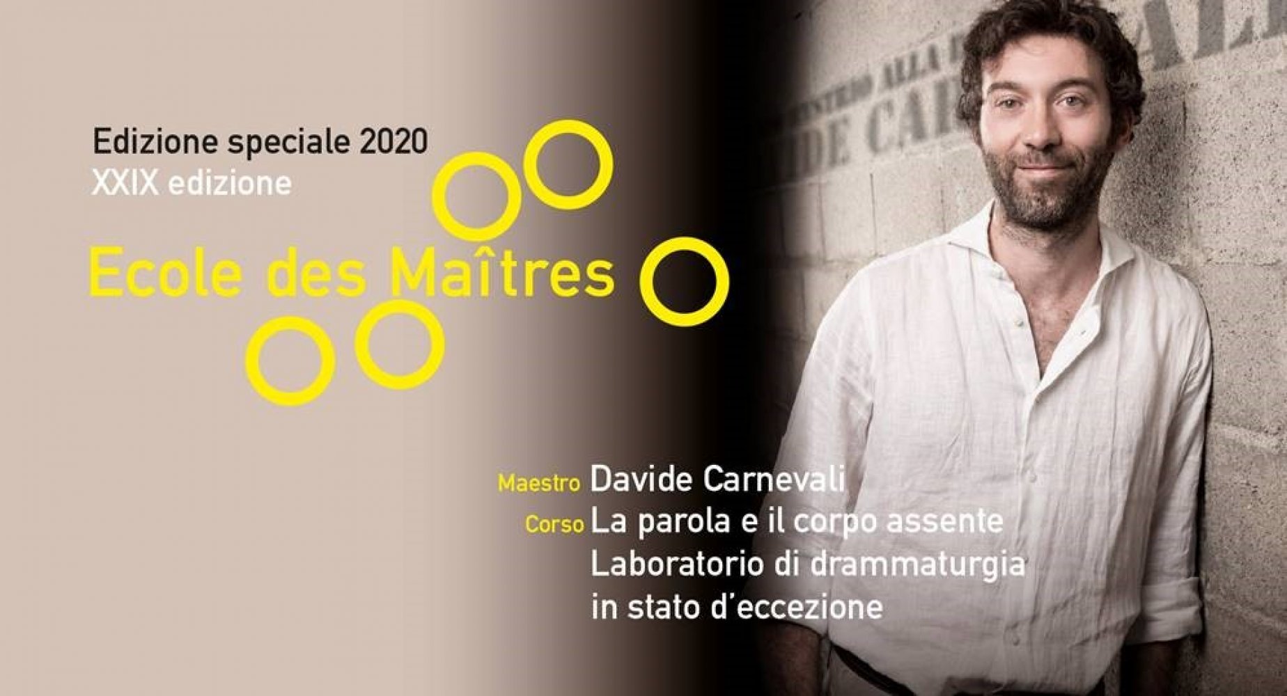 Un’edizione d’eccezione in stato d’eccezione: è un’Ecole anomala ma altrettanto formativa e importante l’Edizione 2020 dell’Ecole des Maîtres che prende il via oggi con il primo della serie di incontri - prima a distanza e, appena possibile, anche in presenza -  fra Davide Carnevali, il maestro-guida di quest’anno, e 8 giovani drammaturghi europei under 35.