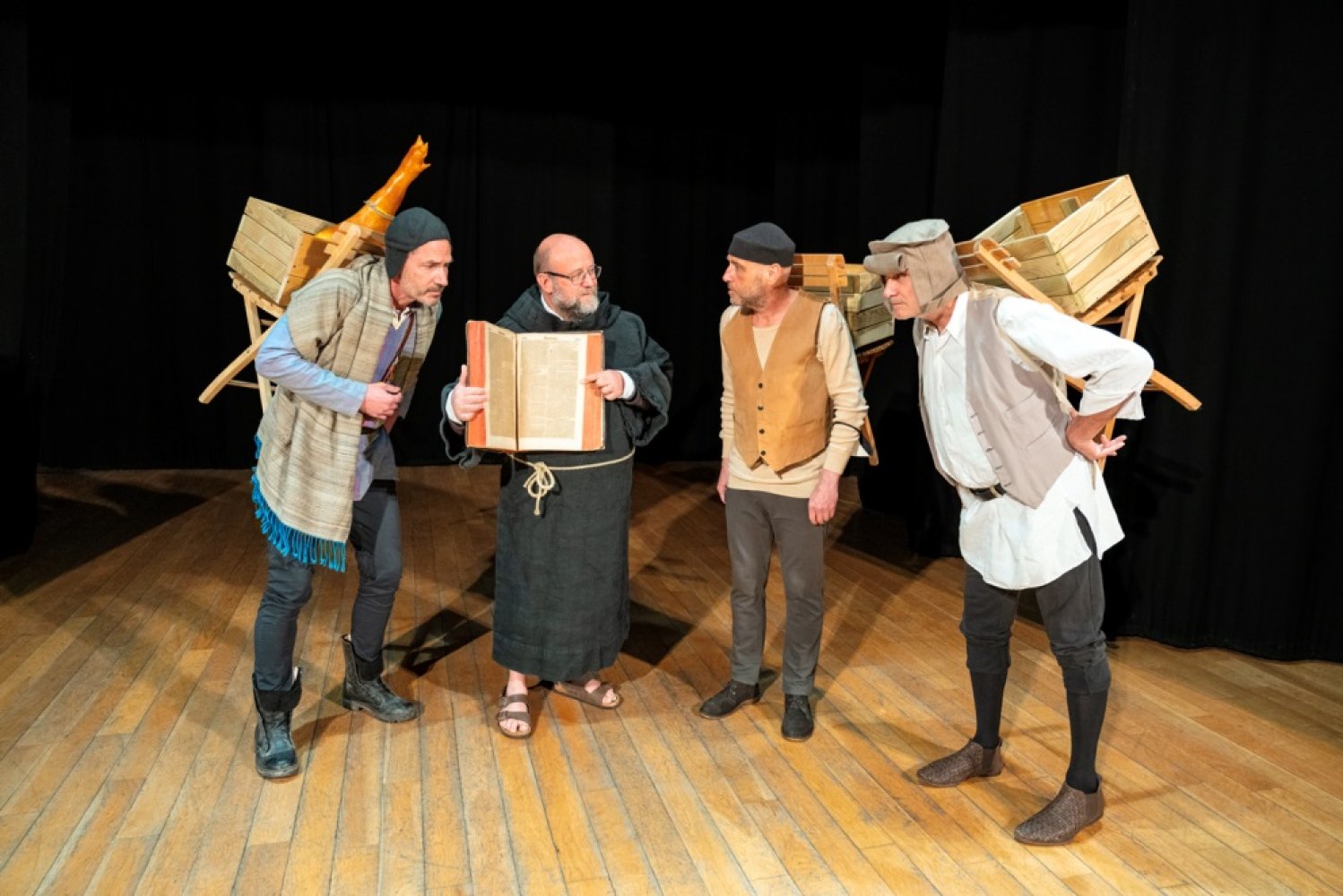 Per la prima volta assieme, anche in scena, i quattro interpreti si sono immaginati uno spettacolo che può essere paragonato a una di quelle allegorie medievali attraverso le quali i chierici vaganti o i predicatori di strada raccontavano temi profondi mescolando insieme sapori semplici, e forse per questo universali, comprensibili da tutti. Le conoscenze di un esperto filologo medioevale come Angelo Floramo e la sapienza comica popolare del trio friulano si fondono mirabilmente, fra sacro e profano, citazioni colte e trovate popolari, in perfetto stile “Incerto”.