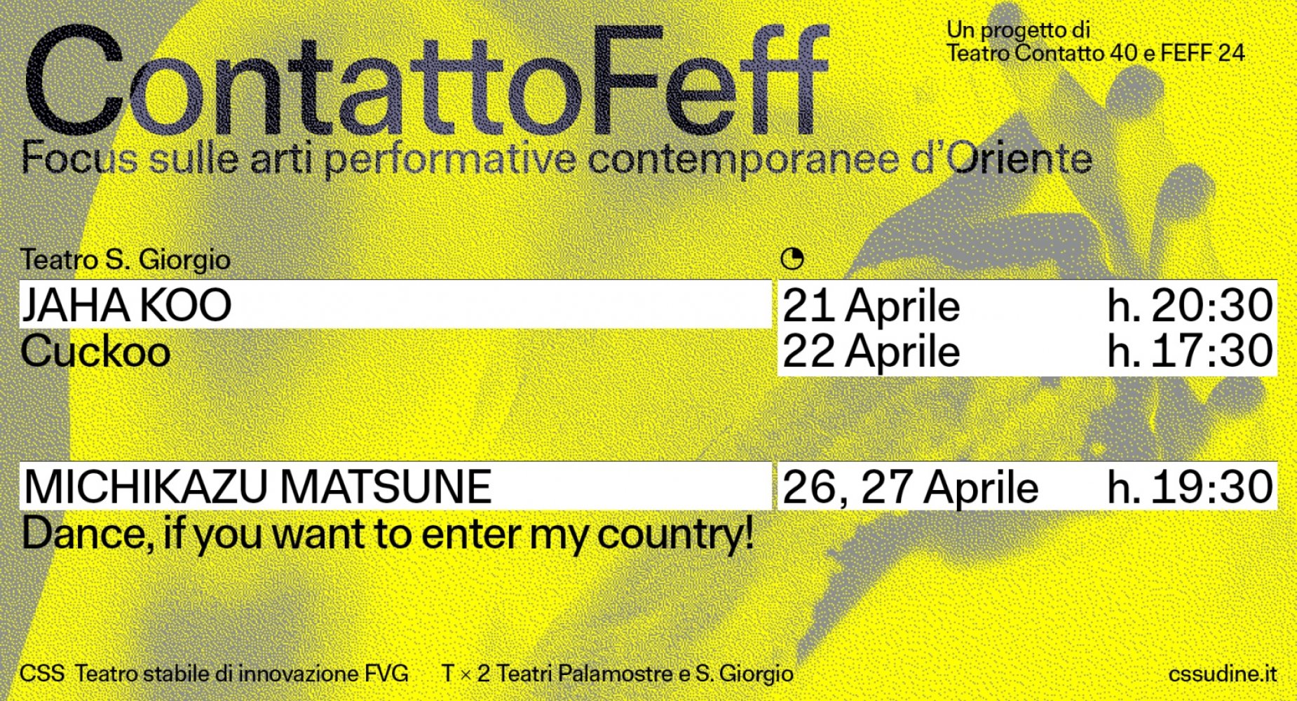 Al performer e compositore Jaha Koo è affidata la serata di anteprima del FEFF 24, il 21 aprile, con Cuckoo: uno spettacolo multidisciplinare che intreccia video, creazioni musicali, parole e installazioni. L’immersione nell’arte performativa asiatica di Contatto FEFF continuerà, poi, con Dance, if you want to enter my country! del coreografo Michikazu Matsune, noto per le sue performance assurdamente poetiche e notevolmente realistiche che riflettono il nostro essere nel mondo globalizzato di oggi.