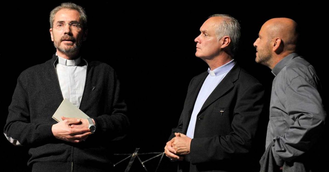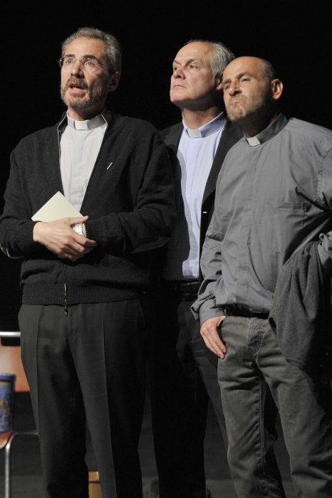 Tre sacerdoti in una sala d’attesa.
