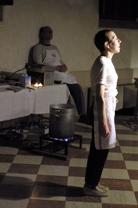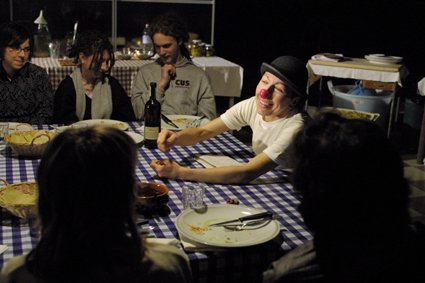 locandinaLa tovaglia a quadri, i taglieri con i salumi, le noci e le bottiglie di vino frizzante. Una ventina di commensali seduti attorno al grande tavolo. Teatro da mangiare? Alla fine degli anni '80 Stefano Pasquini e Paola Berselli facevano gli attori. Poi ne hanno avuto abbastanza e hanno deciso di ritornare alle proprie origini contadine. Oggi vivono e lavorano in campagna, in un vecchio podere di famiglia trasformato in agriturismo, nel cuore di una valle umida e fredda, poco distante da Bologna. Nel silenzio di questa valle è cresciuta la loro storia e, pochi anni dopo, anche il bisogno di condividerla. Teatro da mangiare? è nato così, in casa, anzi in cucina: racconto per amici riuniti attorno al tavolo allestito nella vecchia casa colonica. Con l'acqua che bolle, la sfoglia per le tagliatelle, le canzoni e le storie di dieci anni della loro e della nostra vita. Una confessione in pubblico. Un autobiografia singolare. Forse quella di un'intera generazione. Per passare dal dolore alla gioia, alla malinconia, mangiando il pane, le verdure, la pasta (tutto cibo biologico, coltivato e preparato da loro stessi) mentre un sorriso spontaneo si mischia al tragico della vita, e il teatro e le parole conquistano il centro. Dopo tante repliche nella casa colonica delle Ariette, ora Teatro da mangiare? si gusta anche nei teatri. Non si vede più la campagna emiliana oltre le finestre. Ma il sapore delle tagliatelle non è cambiato, e la genuinità e la sincerità sono le stesse.