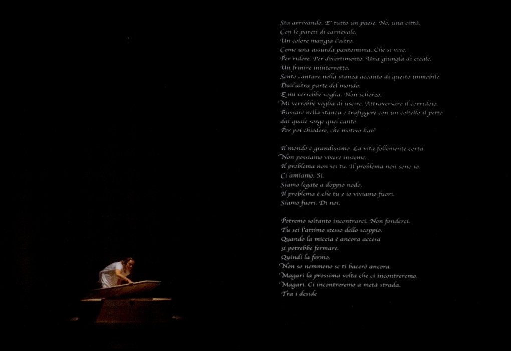 Prendi una donna fuori dall’ordinario, Marina, abbracciata esclusivamente dal cielo, che cresce isolata afferrandosi alla memoria, come un fatale testamento in bottiglia da affidare alla Storia. Prendi un vecchio immobile. Prendi un piano qualunque di questo immobile. Prendi una stanza del piano. Indicata dal Caso. Alveolo. Cella candida per sussurrare un’asimmetria che fonde insieme scarti esistenziali. Prendi i suoni. Prendi i racconti bisbigliati. Prendi le immagini che vomitano i quotidiani, i social network. Tetris animistici. Vite meno reali della tv satellitare a circuito chiuso. Chiavi per entrare nei vasi comunicanti di un organismo che pulsa di vite disordinate. Pulsa simultaneamente. Mantice-mastice, che imbriglia e incastona una polifonia semiotica che graffia la gola.