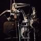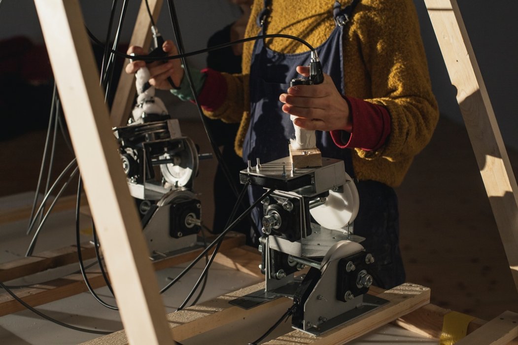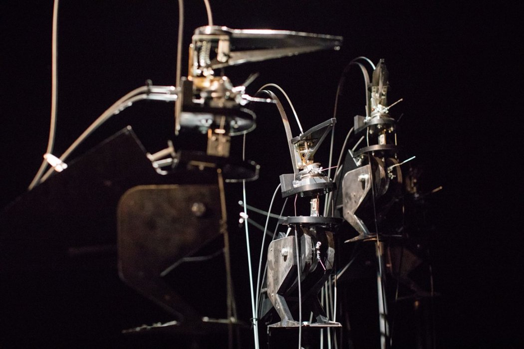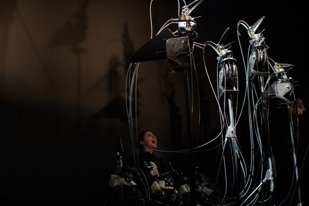Il dispositivo costruito per Il canto della caduta, produce la movimentazione di un sistema complesso di leve a cavo attraverso dei joystick meccanici manovrati dalle mani di un'unica attrice.