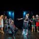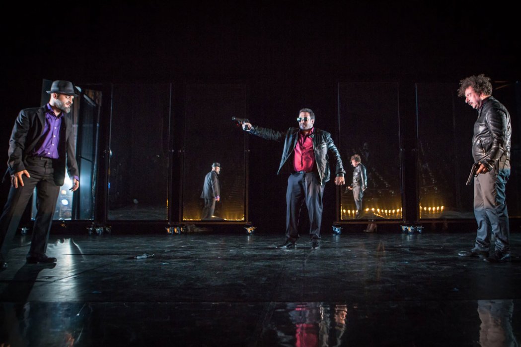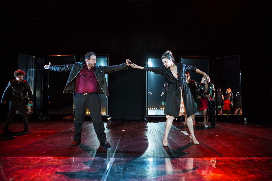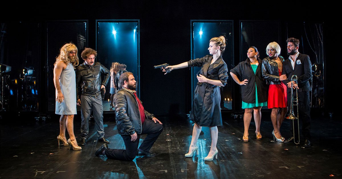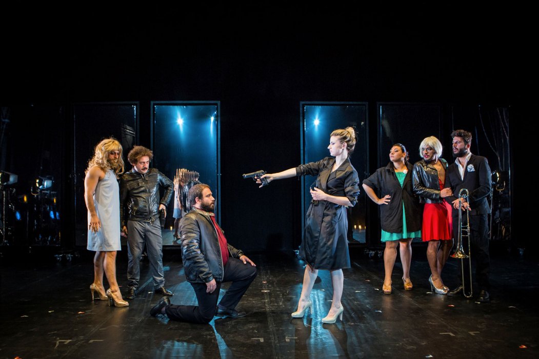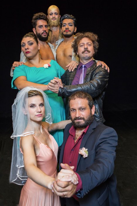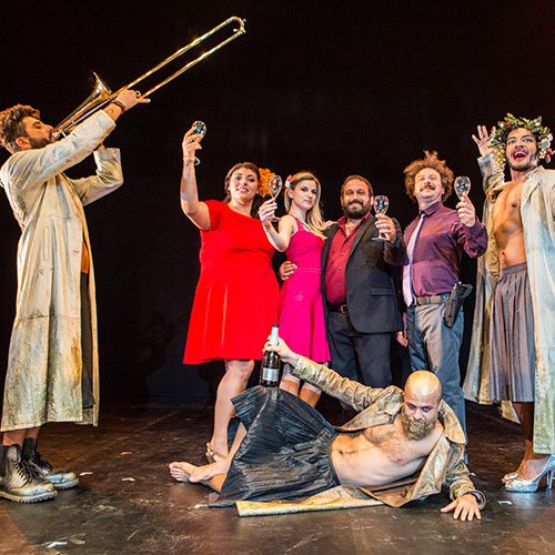 “Sei attori e un musicista per creare una coralità multiforme e tragica che però agisce come un contrappunto grottesco e farsesco in uno spazio che disegna doppi mondi: divino e umano. Un andirivieni continuo tra un sopra e un sotto, tra luci e ombre.