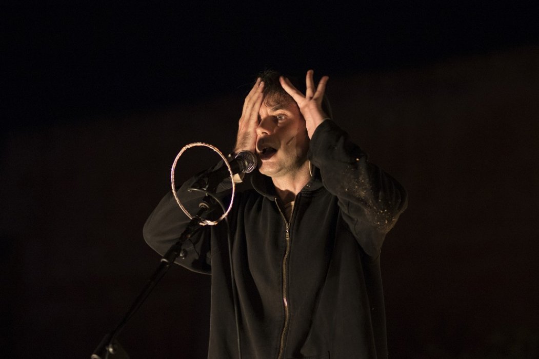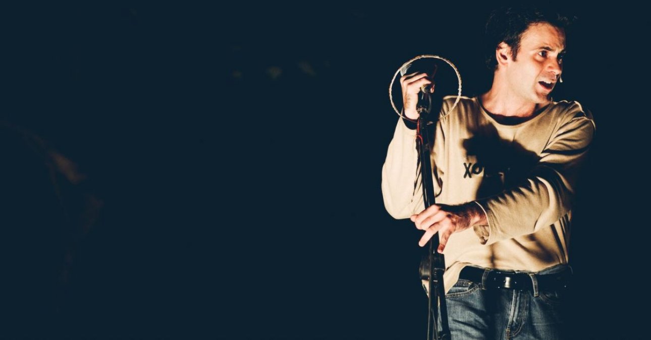 “Tra vecchi dischi e nuove impressioni, un corpo solo, quello di Gabriele Portoghese, all’ora viola, sospesa tra giorno e notte, segue orme poetiche e sonore, per le strade di un mondo che morendo rinasce.