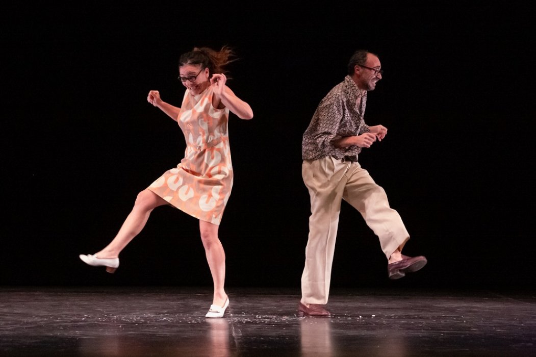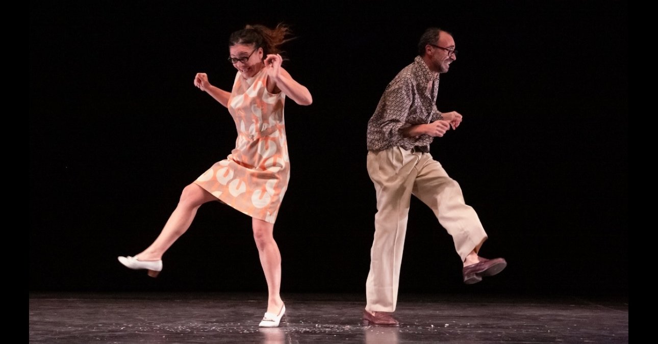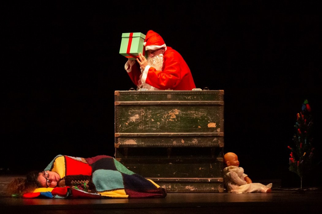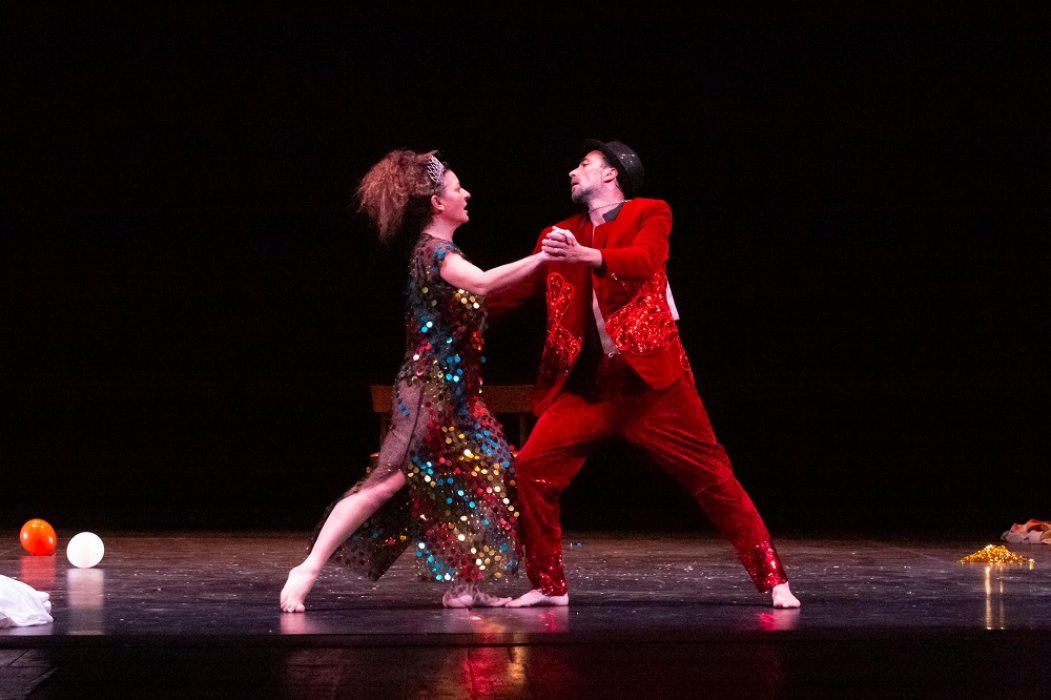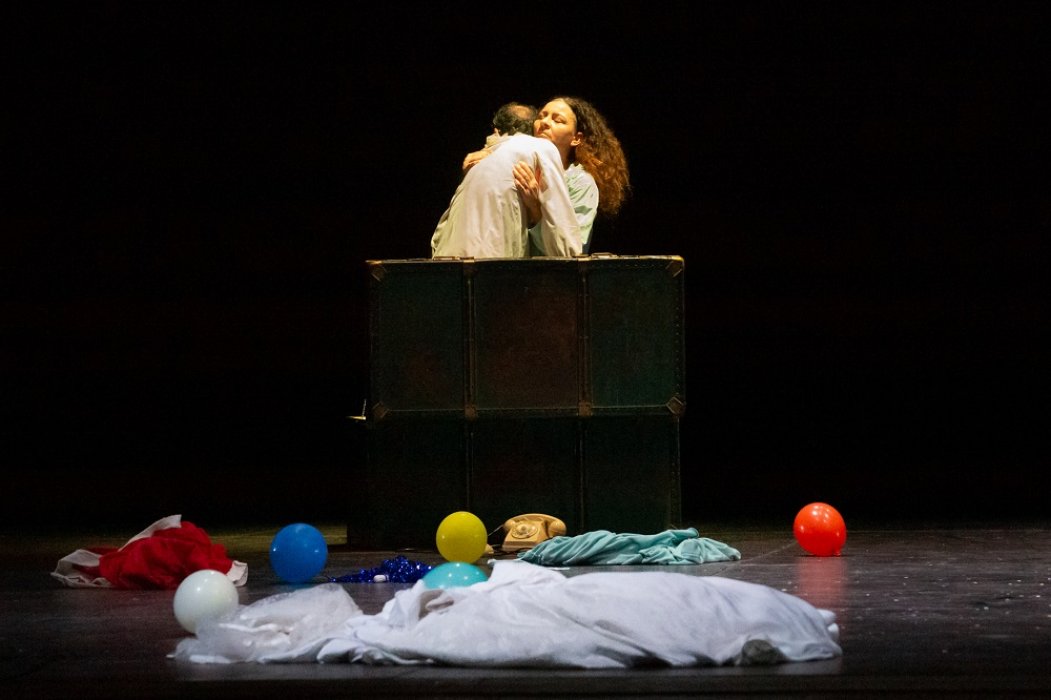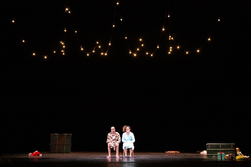 «Una vecchina fruga dentro un baule. Estrae un flacone di pillole, un velo da sposa, un telecomando, tanti palloncini colorati... Da un altro baule, la musica di un carillon. Compare un uomo anziano. Indossa un vecchio abito da cerimonia liso dal tempo. L’uomo guarda la donna e sorride. Subito la raggiunge. L’abbraccia. La donna appoggia la testa sulla spalla di lui. Lui le fa una carezza. Lei lo tiene stretto per non perdere l’equilibrio. Lui la sostiene. Ballano. Lui estrae dalla tasca un orologio da taschino: meno cinque… meno quattro… meno tre… meno due… meno uno… e al rintocco della mezzanotte lui fa scoppiare un petardo. Si baciano. Lui lancia in aria una manciata di coriandoli. La festa ha inizio.