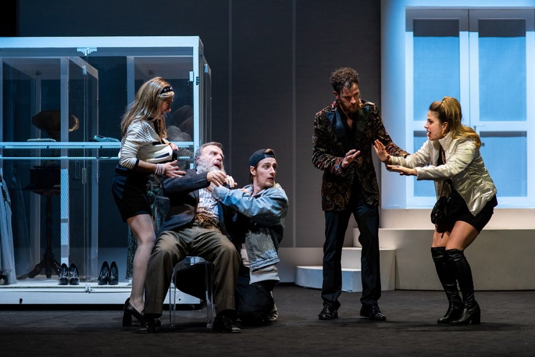 La regia di Saravo ambienta lo spettacolo in una dimensione che rimanda al nostro quotidiano, giostrando riferimenti temporali diversi, dagli smartphone agli abiti anni Settanta agli spot che tormentano Arpagone. Anche le musiche originali di Paolo Silvestri si muovono su piani diversi, mentre la nuova traduzione di Letizia Russo, fresca e diretta, contribuisce a dare al tutto un ritmo contemporaneo. A fianco di Ugo Dighero, Mariangeles Torres è impegnata in un doppio ruolo: sarà Freccia, il servitore che sottrae la cassetta di denaro di Arpagone, e la domestica/mezzana Frosina, ovvero i due personaggi che muovono l’azione, scatenando l’irresistibile gioco degli equivoci, sino al ribaltamento di tutte le carte in tavola.