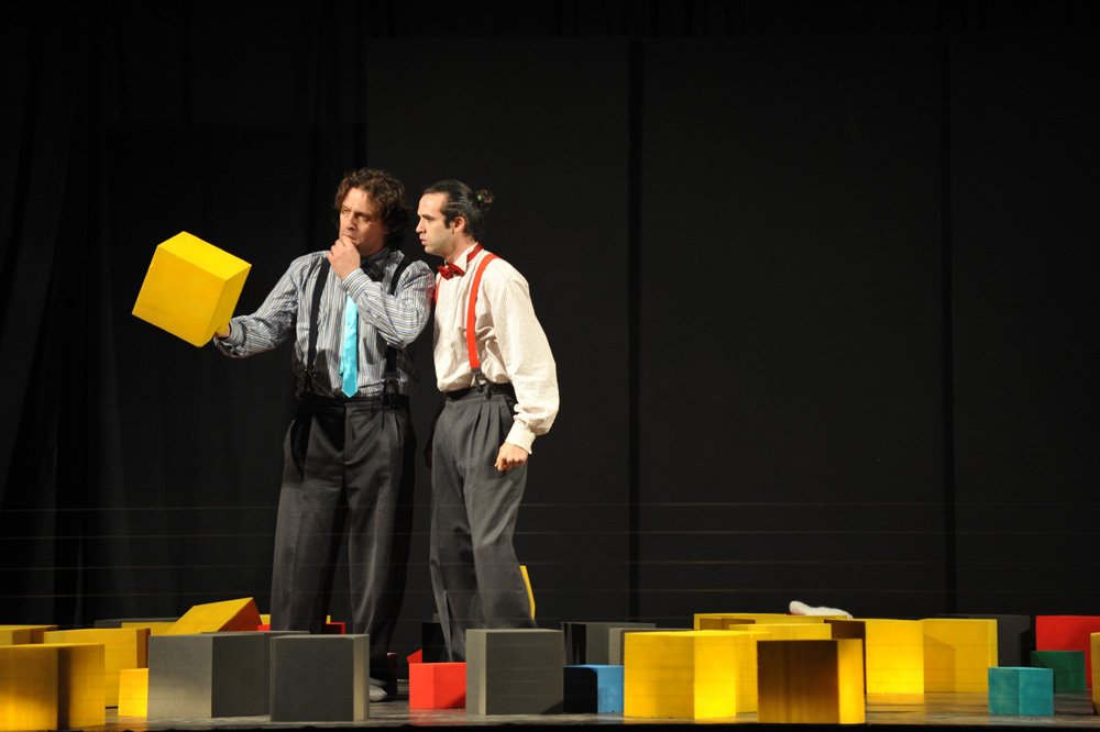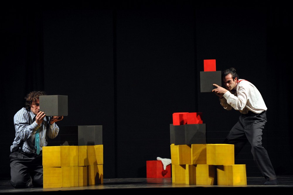 Lo spazio scenografico, all’inizio spoglio è mutevole e viene disegnato attraverso l’immissione in scena di 80 cubi di dimensioni e colori differenti che fungono non solo da oggetto di scena ma ricreano, di volta in volta, strade, muri, torri di castello…