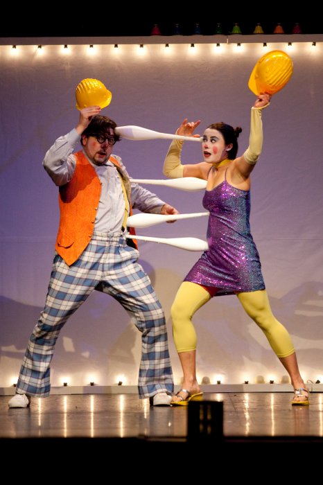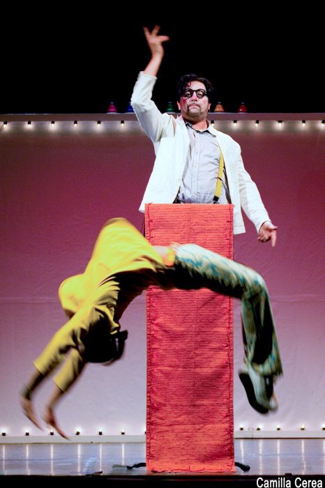 Uno spettacolo in cui i numeri circensi non sono solo quelli degli attrezzi e dei corpi ma anche quelli delle parole. Parole che escono dalla penna dello scrittore veneziano Tiziano Scarpa, già premio Strega e autore per Pantakin de L’ultima Casa (premio “Chièdiscena” migliore testo de La Biennale Teatro del 2007).