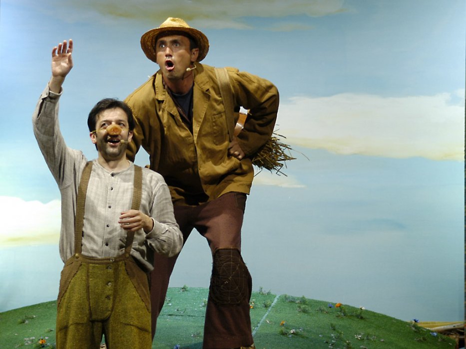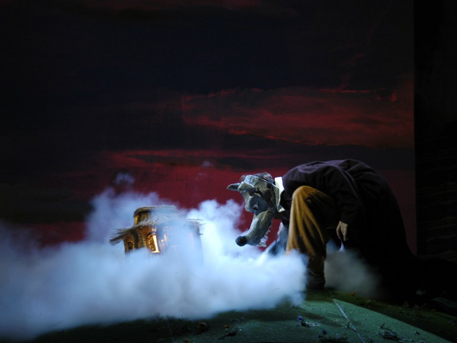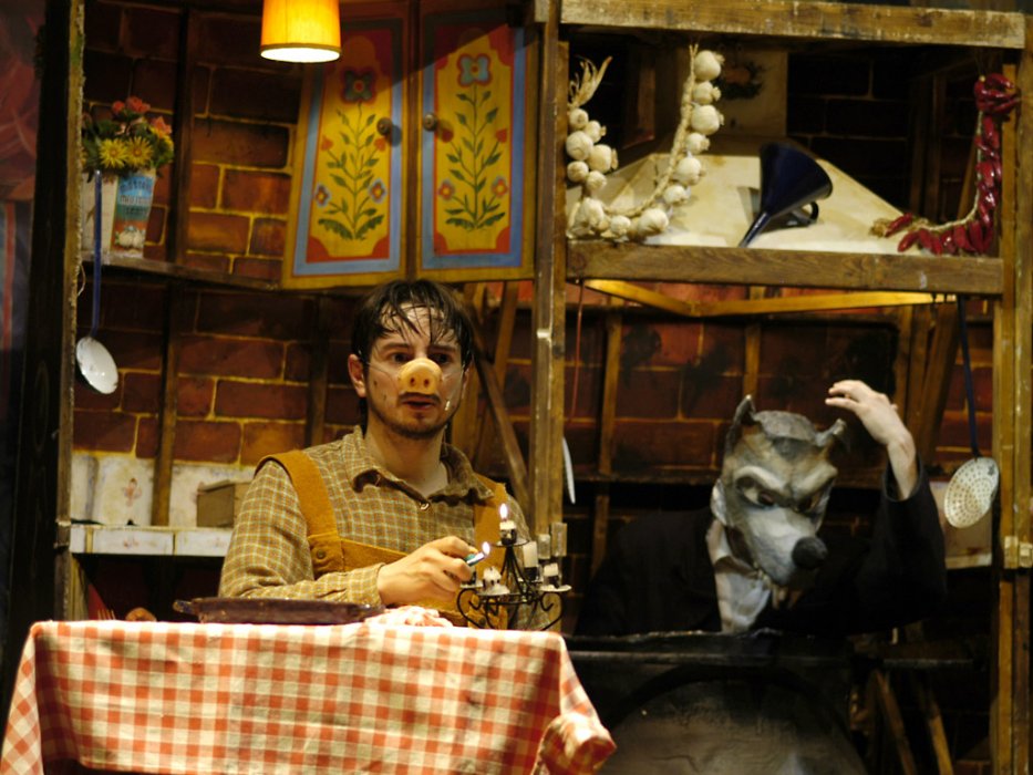 I tre porcellini è un classico racconto inglese, una di quelle storie che i nonni raccontano ai nipotini di generazione in generazione. La scelta del materiale per costruirsi la casa diventa il pretesto per ragionare sui piaceri e sui doveri della vita, sui consigli di una mamma molto presente, sulla paura di andare per il mondo da soli, sull’esistenza vera o presunta del lupo.  Nello spettacolo la figura del lupo gioca tra la necessità animale di seguire la propria natura e la voglia di fare paura, nella consapevolezza che ai bambini un po’ piace avere paura, in un susseguirsi di situazioni comiche ed intense.