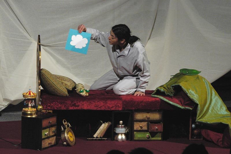 locandinaAvete mai fatto caso a tutte le cose che finiscono sotto il letto? E si rintanano anche, si nascondono, e tu non riesci a trovarle… I sogni, per esempio… Io credo che si nascondano non si sa dove … si dileguano così, all’improvviso. Da qualche parte devono pur essere andati? E poi… tutte le paroline della buona notte, o le canzoni che la mamma canta quando si è già sotto le coperte, o le storie che ai primi sbadigli svaniscono improvvisamente nel nulla… È proprio così. Ma accade anche che sotto il letto il tempo si fermi, e puoi ritrovare quel che ci è finito sotto, così come è rimasto nel ricordo… basta usare la formula giusta ! Ed ecco che Silvia ritrova evocate dal nulla le cose della sua infanzia: una bellissima foglia grande e verde, un vecchio aquilone, un ombrello strampalato, una radio quasi magica, una nuvoletta innamorata del mare, un bruco che non vuole crescere per diventare farfalla… oggetti che a Silvia permettono di rituffarsi nel suo passato e ritornare almeno per un po’ bambina.