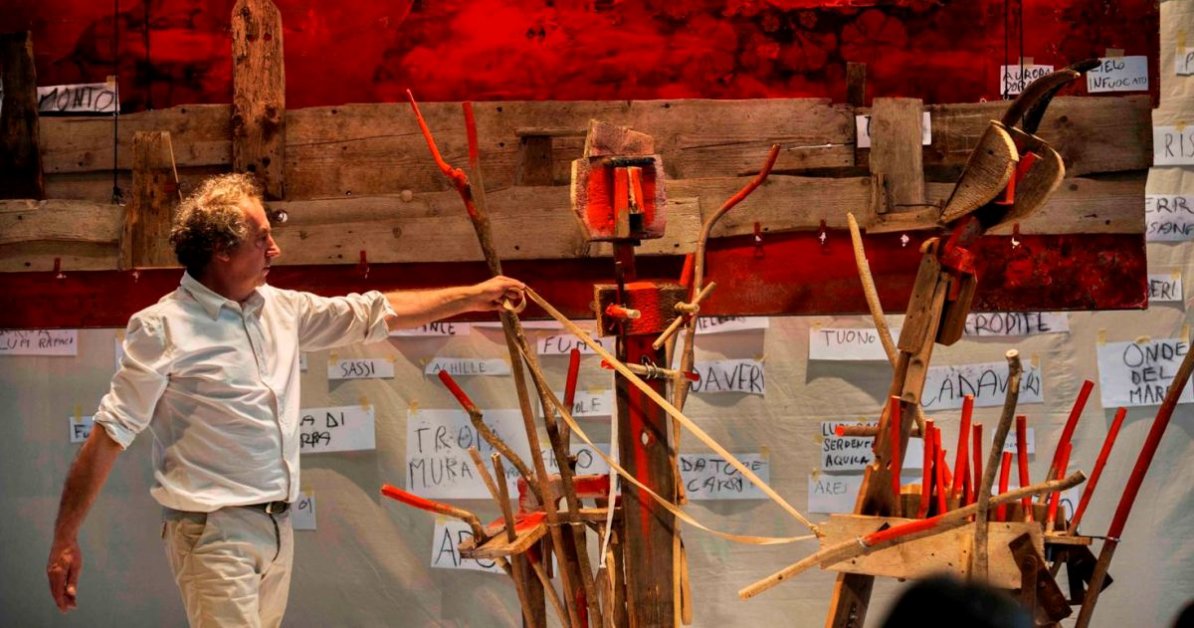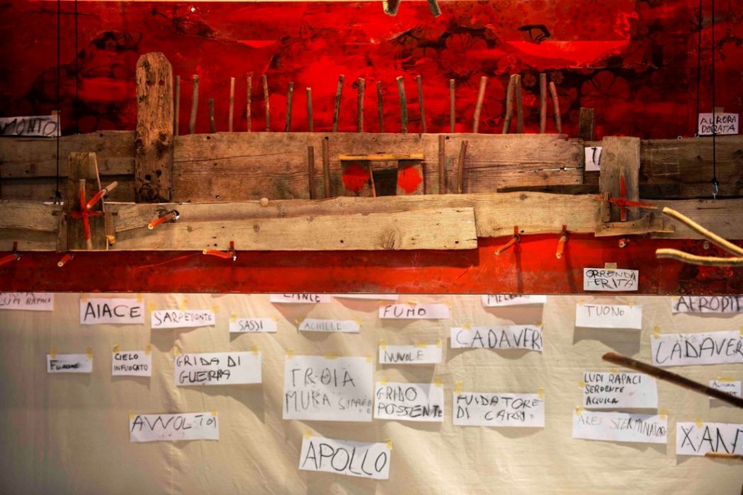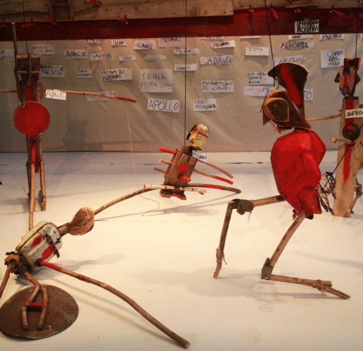 Uno spettacolo, sul filo del racconto del più antico poema d’Occidente, raccontato dagli oggetti e dalle immagini di Antonio Panzuto, con le voci dei bambini che sfidano le parole sapienti e preziose di Omero. Figure e parole appese a fili e sospese nella polvere, combattenti sopraffatti e vincitori smarriti si contendono il campo di battaglia in un’azione teatrale che segue le regole serie, un po’ oscure di un gioco mitico. Omero e leggenda, probabile poeta mai esistito, le cui tracce si perdono nel nulla: vaghiamo tra le sue parole e le meravigliose similitudini, avvolte dalla natura e dallo spirito dei venti, alla ricerca di una verità impossibile, per raccontare il mito di una guerra infinita che dura fino ai giorni nostri.